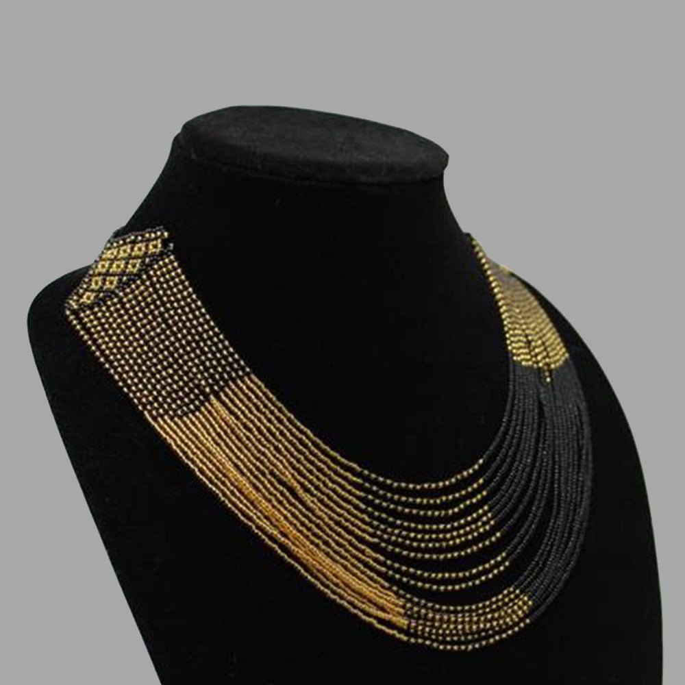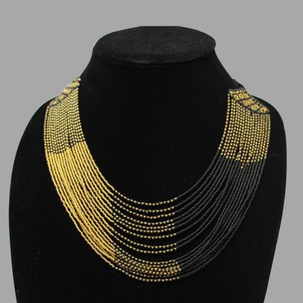 This unique necklace lies beautifully around the neck and is a sure attention gainer. It looks like something that came off of a high fashion runway. This particular necklace is handcrafted which makes the necklace more versatile. You can wear this necklace every season, throughout the year.