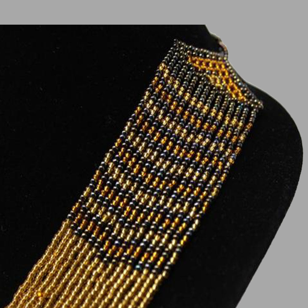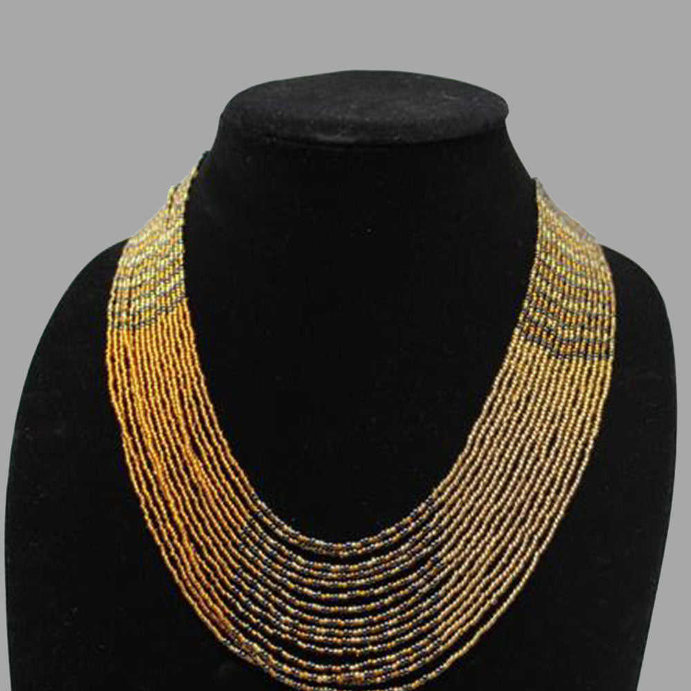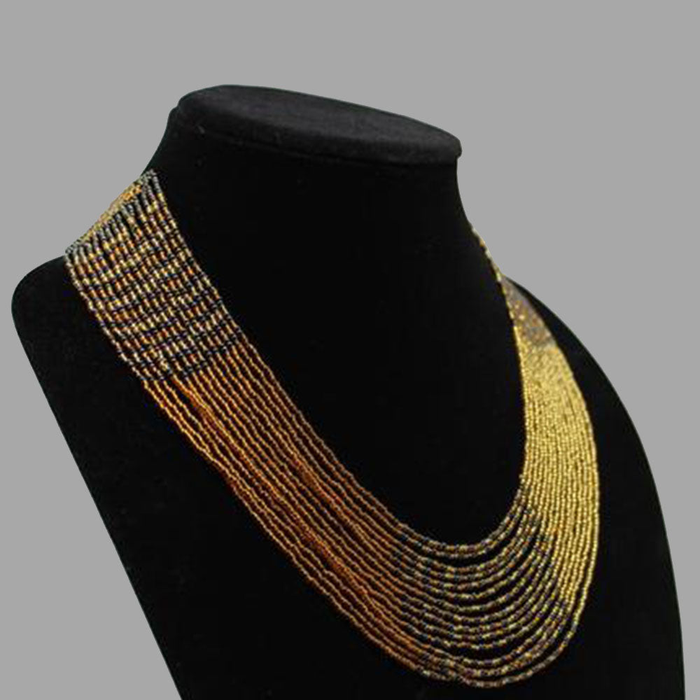 This unique necklace lies beautifully around the neck and is a sure attention gainer. It looks like something that came off of a high fashion runway. This particular necklace is handcrafted which makes the necklace more versatile. You can wear this necklace every season, throughout the year.