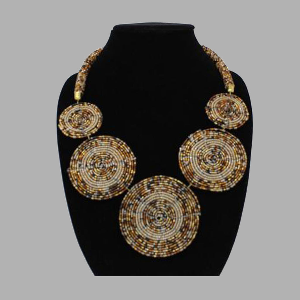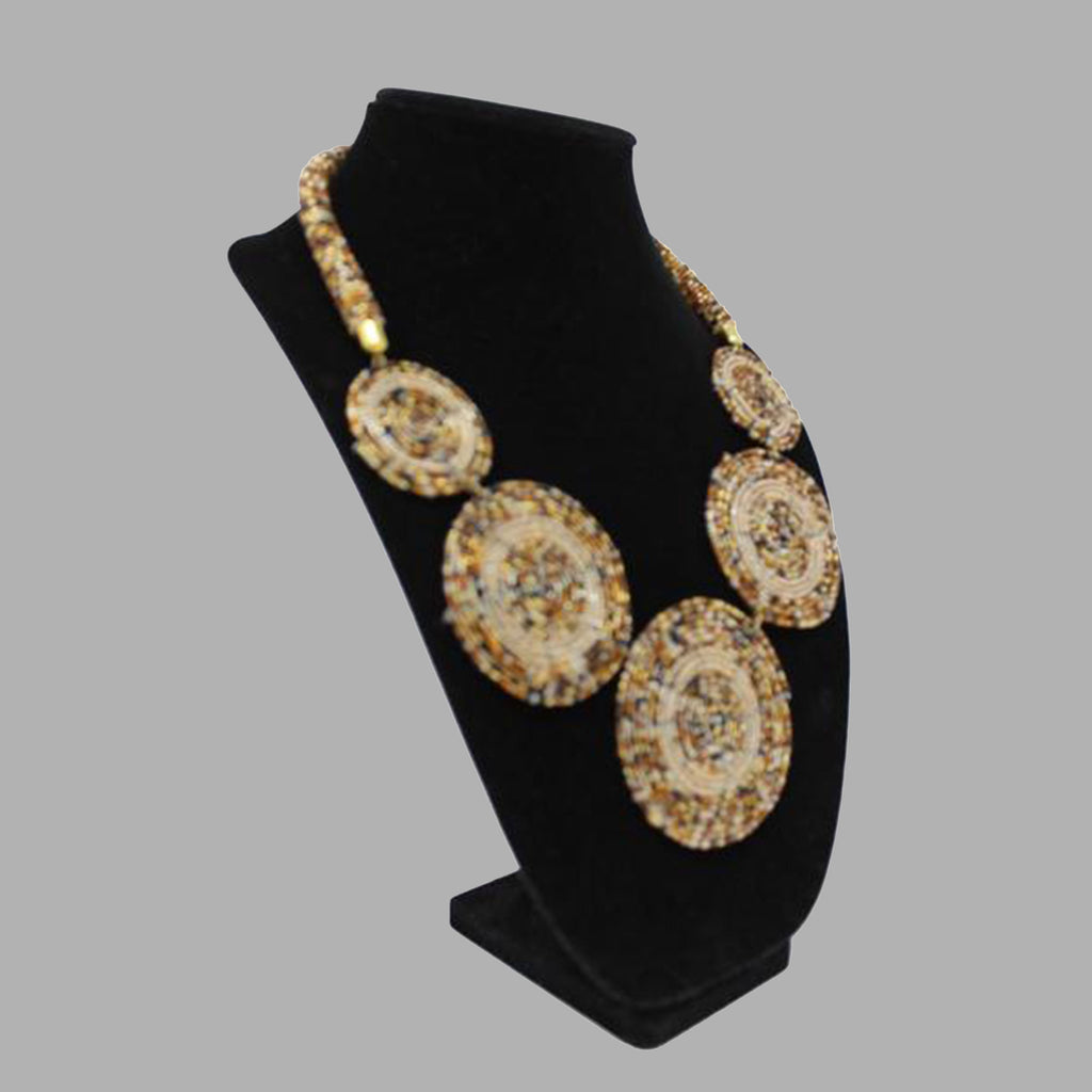This unique necklace lies beautifully around the neck and is a sure attention gainer. It looks like something that came off of a high fashion runway. This particular necklace is handcrafted which makes the necklace more versatile. You can wear this necklace every season, throughout the year.